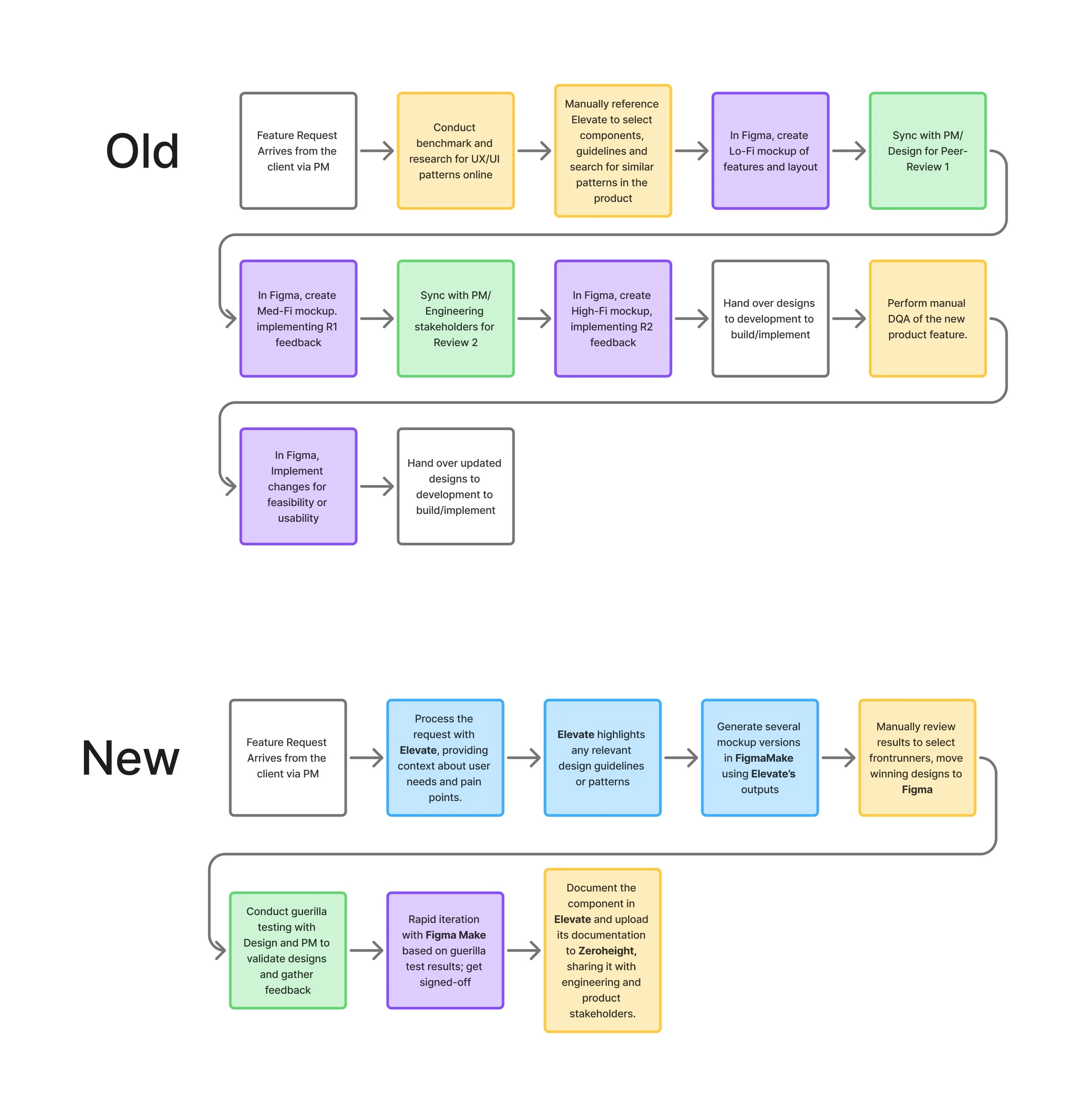 The problem wasn't the people. It was the sequence. Design was being asked to present fully-formed thinking to partners who hadn't been part of forming it, which made every review feel higher stakes than it needed to be. I introduced a new framework to change that. Designers began using an internal GPT to query our design system, personas and research repository before putting pen to paper, then created rough low-fidelity variants using rapid prototyping tools. These napkin sketches went straight to product managers and engineers for early, informal feedback. That feedback shaped the medium and high-fidelity work that followed, which could then be guerrilla tested with internal stakeholders before anything went through formal design review.